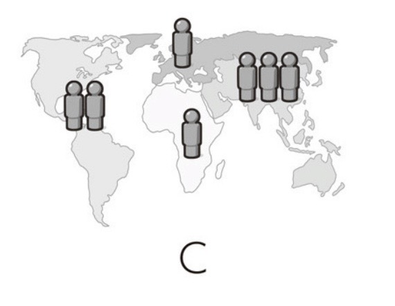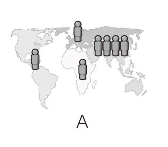 質問8:現在、世界には約70億人の人がいます。次の地図では人の印がそれぞれ10億人を表しています。世界の人口分布を正しく表しているのは、3つのうちどれでしょうか?